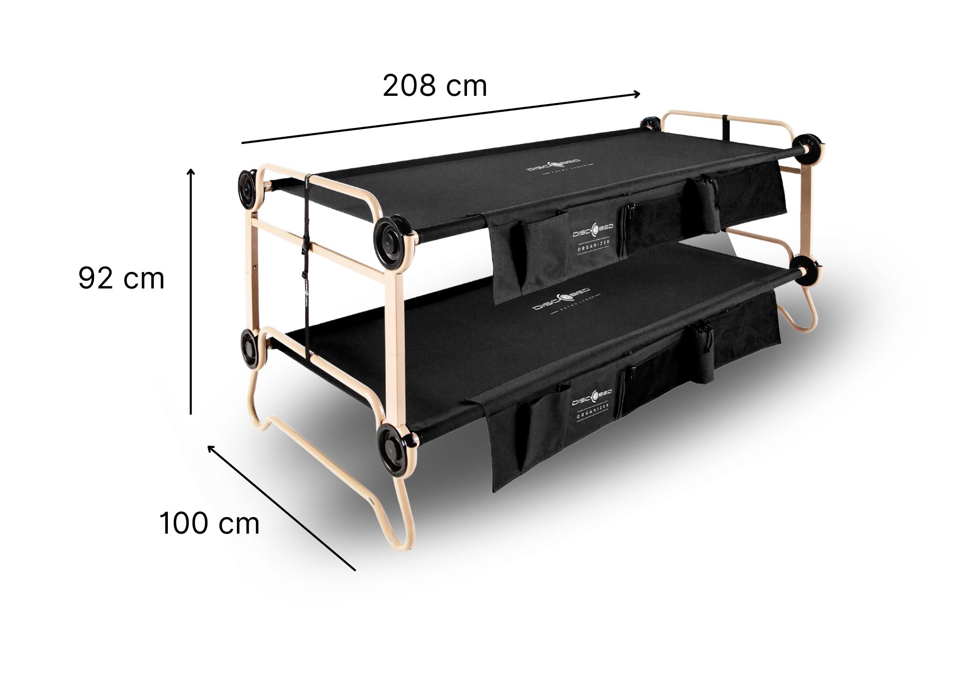 Das XL-Disc-Bed bietet dir zwei vollwertige Schlafplätze übereinander. Extra breite Liegeflächen ohne störende Querstangen – robust, bequem und richtig viel Raum für Erholung.